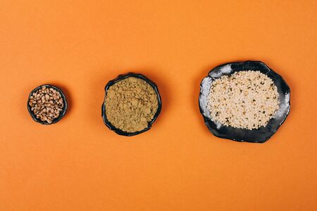Different types of uses for hemp. Seeds, protein and powder in ceramic bowls.