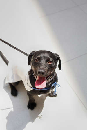 A close-up of a black and white dog with expressive brown eyes sitting in a warm indoor space. The dog appears alert and curious, showcasing its playful personality.