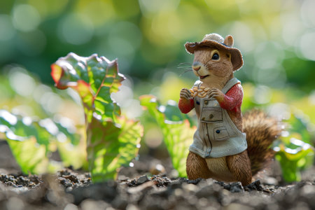 A squirrel is standing in a garden with a hat on and holding a nut. The scene is peaceful and serene, with the squirrel enjoying its time in the garden