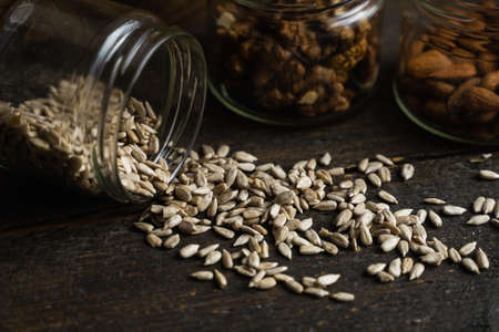 Sunflower seeds scattered on the wooden vintage table from a jar.