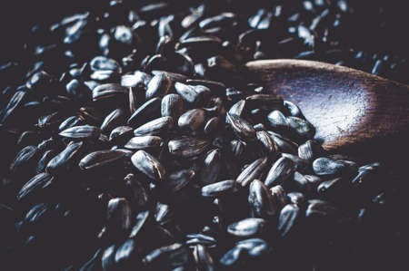 Fried sunflower black seeds with a wooden spoon in a pan, close up