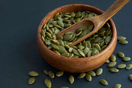 pumpkin seeds in a wooden bowl and vintage scoop. Close up on a black background. copy space for text