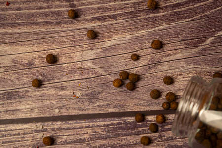 Black allspice scattered on a wooden background and a glass spice jar with black pepper lying on its side. Close up