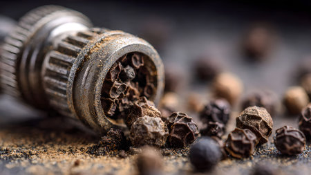 Close-up of black peppercorns scattered around a pepper grinder, showcasing culinary spice and flavor enhancement.