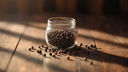 A detailed shot of a glass jar filled with peppercorns, sunlight streaming through, creating interesting shadows and reflections, showcasing the beauty of simple ingredients