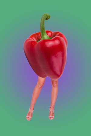 Banner photo collage of anonym female male legs instead body red pepper sweet paprika diet grocery nutrition healthcare veggie