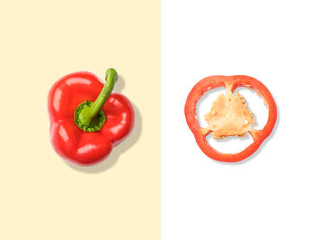 Yellow pepper on a red background and red pepper on a yellow background top view