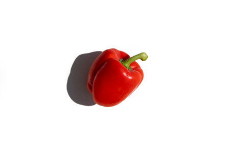 Single red pepper lying on a clean white background, highlighting its bold color and natural curves. A simple, yet striking representation of fresh produce