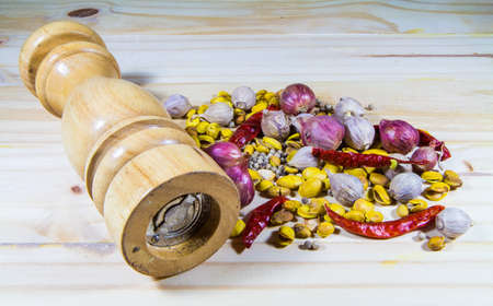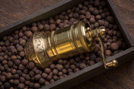 Metal pepper mill in eastern style lying in a wooden box filled with sweet-scented pepper