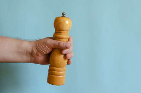 Adult man holds in his hand a wooden pepper mill. Classic spice chopper. Male of European race, 43-45 years old. Kitchen utensils