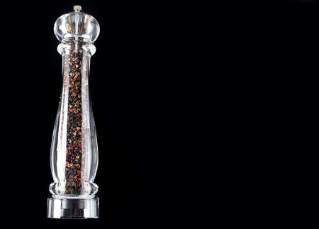 Glass pepper mill with a mixture of peppercorns on a dark background, horizontal format and copy space