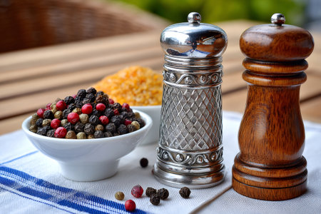 Various peppercorns in a bowl with a salt shaker and pepper mill on a table