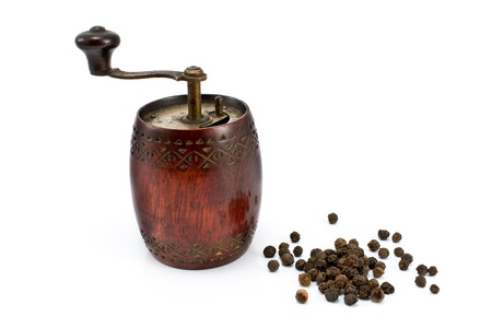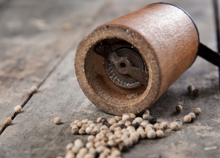 Old Pepper grinder mill with white dried peppers