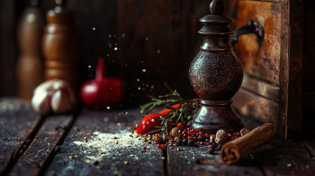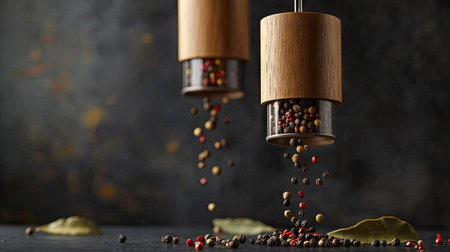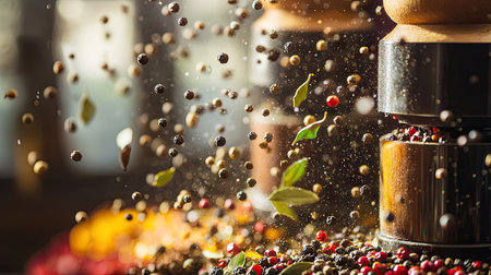 A mesmerizing shot of spice grinders in motion, with colorful peppercorns and fragrant bay leaves suspended in air,