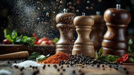 A dynamic freeze-motion capture of spice mills and pepper shakers levitating over a wooden bowl of peppercorns,