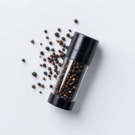 A sleek black pepper grinder rests on a light background, surrounded by scattered peppercorns. This modern kitchen accessory enhances culinary experiences and aesthetic appeal.