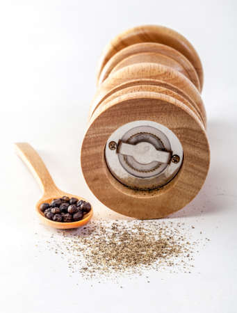 Pepper mill with peppercorns isolated on a white background.