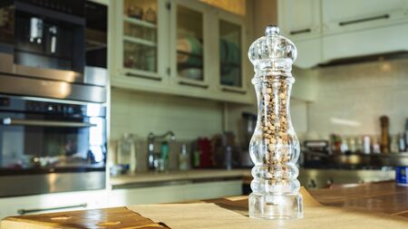 Beautiful glass pepper shaker stands on a wodden table on kitchen background.