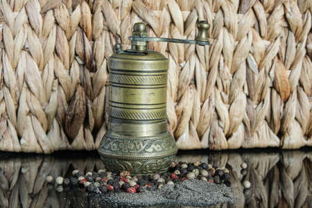 Old metal pepper and spice mill on slate tiles, on a wooden background