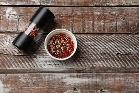 Different peppercorns on wooden table, flat lay. Space for text