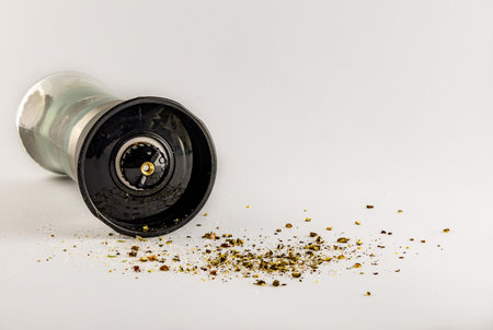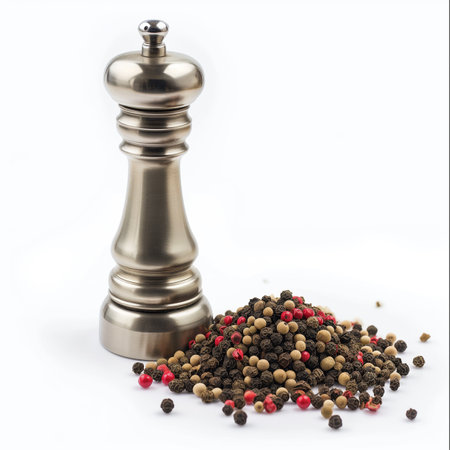 A close-up view of spilled peppercorns from a silver grinder, showcasing the organic textures and colors of these essential kitchen spices, perfect for culinary enthusiasts.