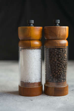 Salt and pepper in a glass container with a grinder,