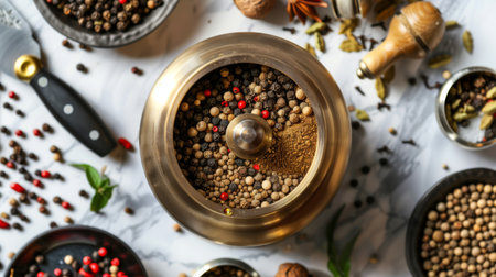 A top view of a modern spice grinder with whole spices and peppercorns on a kitchen counter.