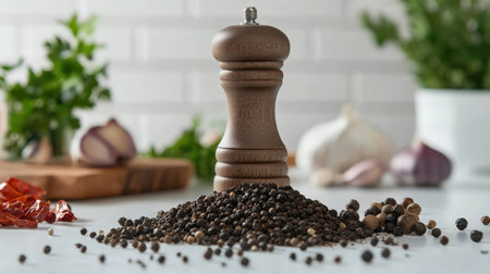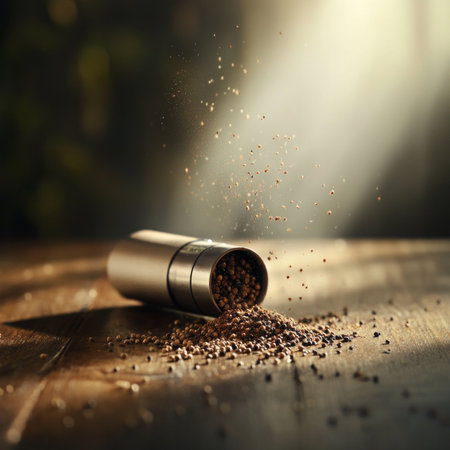 A pepper grinder releases freshly ground peppercorns onto a rustic wooden surface, illuminated by a beam of light, highlighting its culinary aroma and flavor.
