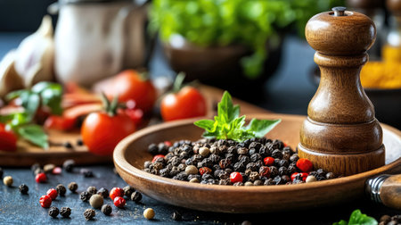 A rustic wooden spice grinder spills a rich mixture of peppercorns, showcasing different textures and colors suitable for a culinary masterpiece.