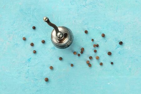 Allspice, Jamaica pepper. Black peppercorns with a vintage pepper mill, overhead shot on a teal blue background with a place for text