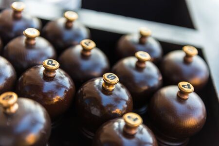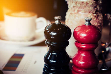 Number of wooden mills with salt and pepper in a restaurant. Shot with a small GRIP