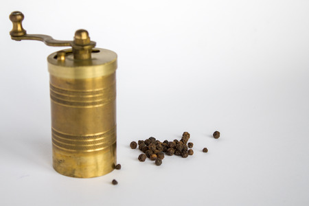 Copper pepper mill. Brass pepper mill. Old copper pepper grinder with pepper grains isolated on white.