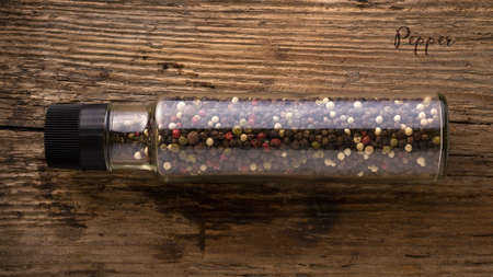 Black pepper in transparent bottle for grinding, it is on the wooden table. Selective focus. Focus on foreground and copy space.