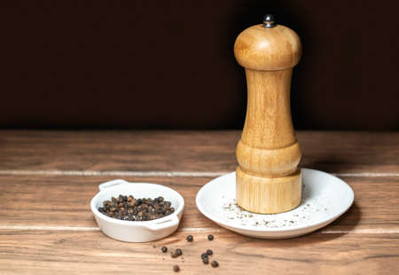 Black pepper mill with peppercorns on a white ceramic plate on a wood table and dark background