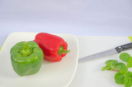 fresh red bell pepper on a light green background with copy space