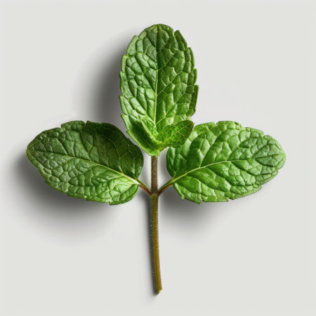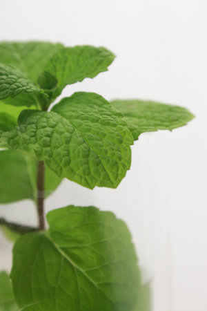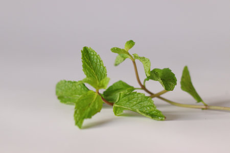 A fresh sprig of mint leaves isolated on a light background highlights the vibrant green color and intricate texture, perfect for culinary uses or decoration.
