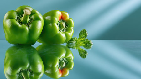 This image showcases fresh green bell peppers with vibrant colors, complemented by mint leaves on a reflective surface, evoking a sense of freshness and vitality.