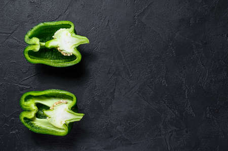 Cut green bell pepper, two halves. Black background. Top view. Space for text