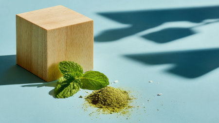 A wooden cube rests beside a sprig of green leaves and a pile of green powder on a blue surface. The image is brightly lit, showcasing crisp details. Shadows are cast by the cube, leaf, and powder, which suggest a natural setting. This image may be suitable for product promotion or conceptual design.