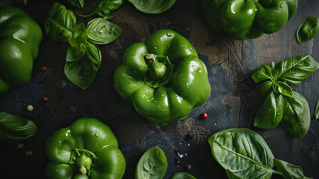 Fresh green bell peppers and basil leaves.