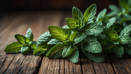 AI Generated. Fresh mint on wooden table, selective focus with copy space for text