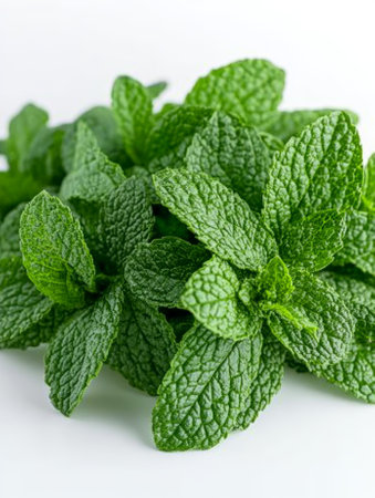 A collection of fresh green mint leaves arranged on a white background, ideal for culinary use, herbal remedies, and showcasing vibrant natural ingredients in your kitchen.