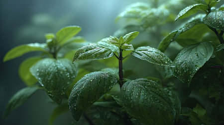 The Thai basil in light fog, dew on leaves, light soft diffused, three-quarter view