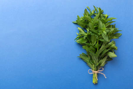 Fresh mint bunch on colored table. Top view with copy space.