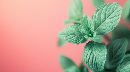 Soft pastel peach transitions into a serene mint green backdrop, highlighting vibrant green mint leaves. The gentle hues create a calm and fresh atmosphere.
