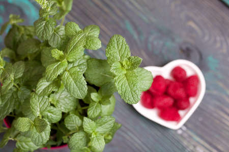 Raspberries on a white surface. Nearby is a pot of mint. On the surface of pine boards painted in black and green.