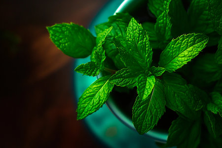 In a close-up view, lush mint leaves glisten under gentle light, highlighting their rich texture and vivid color. The tranquil setting invites a sense of freshness and serenity.