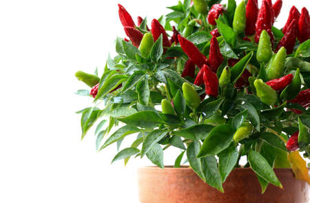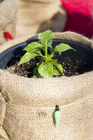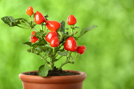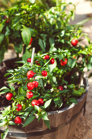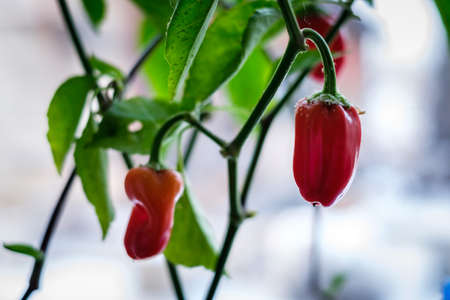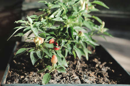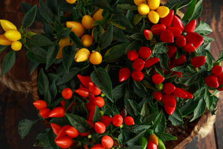 Small red variety of chili pepper grown in pot. Potted pepper.