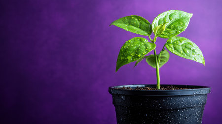 A fresh green plant with glossy leaves sits in a black pot with soil, featuring water droplets, highlighted against a smooth purple background.