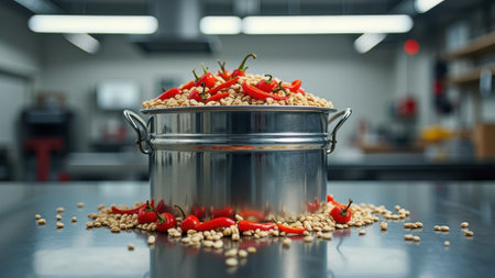 Large metal pot full of red chili peppers and grains in industrial kitchen setting. That the image is generated using AI.